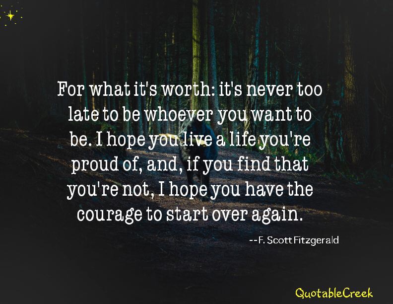 For what it’s worth…it’s never too late, or in my case too early, to be whoever you want to be. There’s no time limit. Start whenever you want. You can change or stay the same. There are no rules to this thing. We can make the best or the worst of it. I hope you make the best of it. I hope you see things that startle you. I hope you feel things you’ve never felt before. I hope you meet people who have a different point of view. I hope you live a life you’re proud of, and if you’re not, I hope you have the courage to start over again.