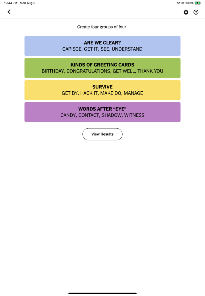Every morning, I wake up and play games. My favorite these days is Connections, a collection of 16 words that you need to group in four groups of four based on a shared connection. Here’s the solution from one last week: