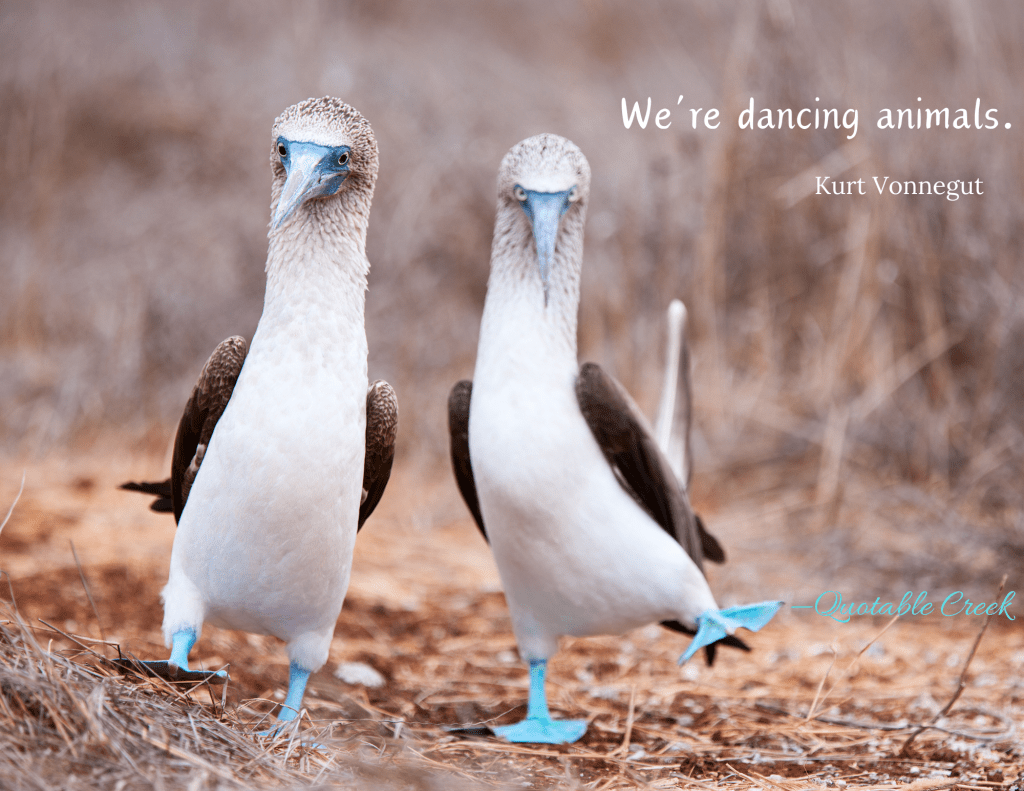 Vonnegut responds, “…And so I pretend not to hear her. And go out to get an envelope because I’m going to have a hell of a good time in the process of buying one envelope. I meet a lot of people. And see some great looking babies. And a fire engine goes by. And I give them the thumbs up. And I’ll ask a woman what kind of dog that is. And, and I don’t know. The moral of the story is – we’re here on Earth to fart around. And, of course, the computers will do us out of that. And what the computer people don’t realize, or they don’t care, is we’re dancing animals. You know, we love to move around. And it’s like we’re not supposed to dance at all anymore.”