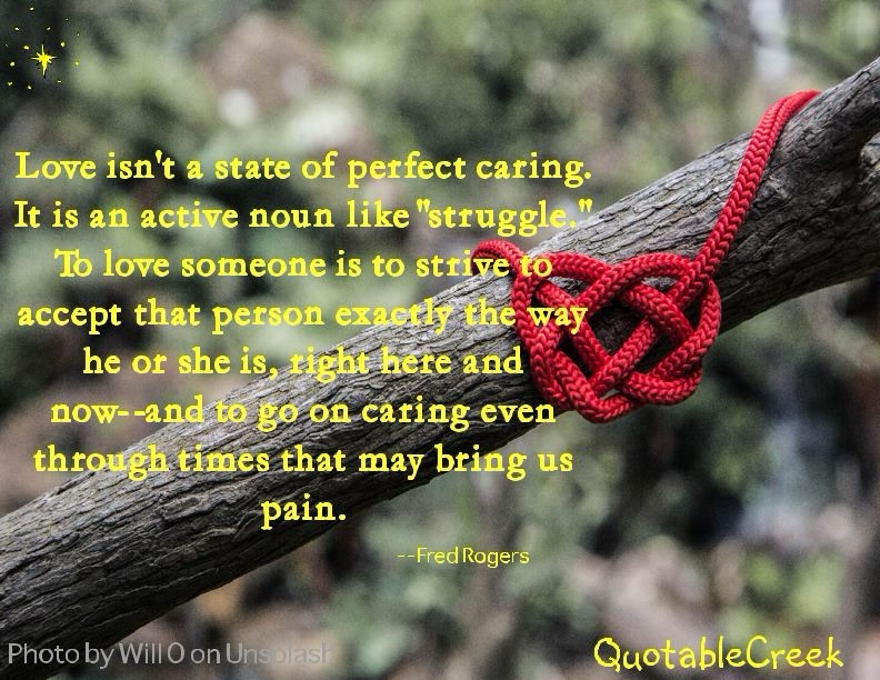 Love isn’t a feeling we fall in and out of. It’s an action we choose to take even when it may be challenging. Sometimes it brings pain. When we think of love as an active verb, like, as Mr. Rogers suggests above, ‘struggle’, rather than as an emotion, it opens our eyes to the fact that we must work at it. It’s a struggle, a constant readjustment and tinkering, constantly expanding our own understanding and empathy.